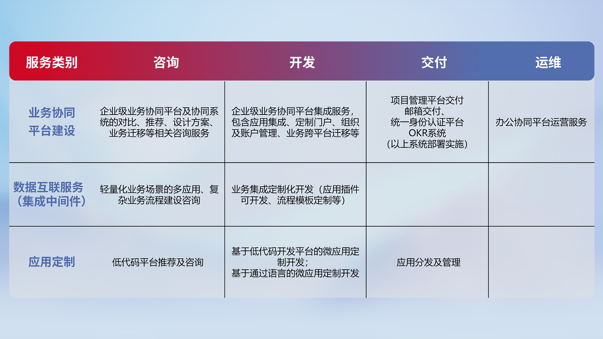 针对钉钉、、、、企微、、、、IDaas等平台级产品提供产品的规划、、、、方案、、、交付、、、、定制化开发等服务,,,,实现如统一协同办公、、智能客户服务、、、、混合会议管理、、智能数据查询、、、、等业务场景,,实现数字化转型。。。